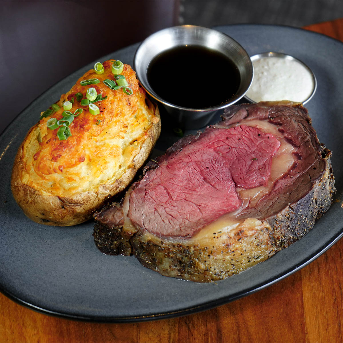 14oz slow-roasted prime rib, au jus, creamy horseradish sauce, our famous twice-baked potato