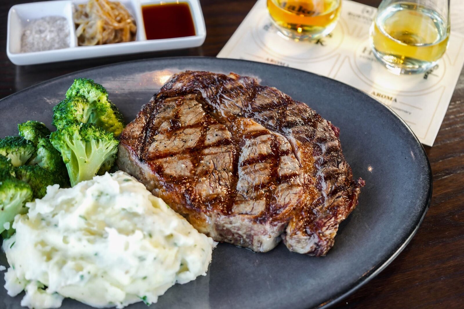 14oz mishima reserve american wagyu ribeye, seasonal vegetable, garlic mashed potatoes