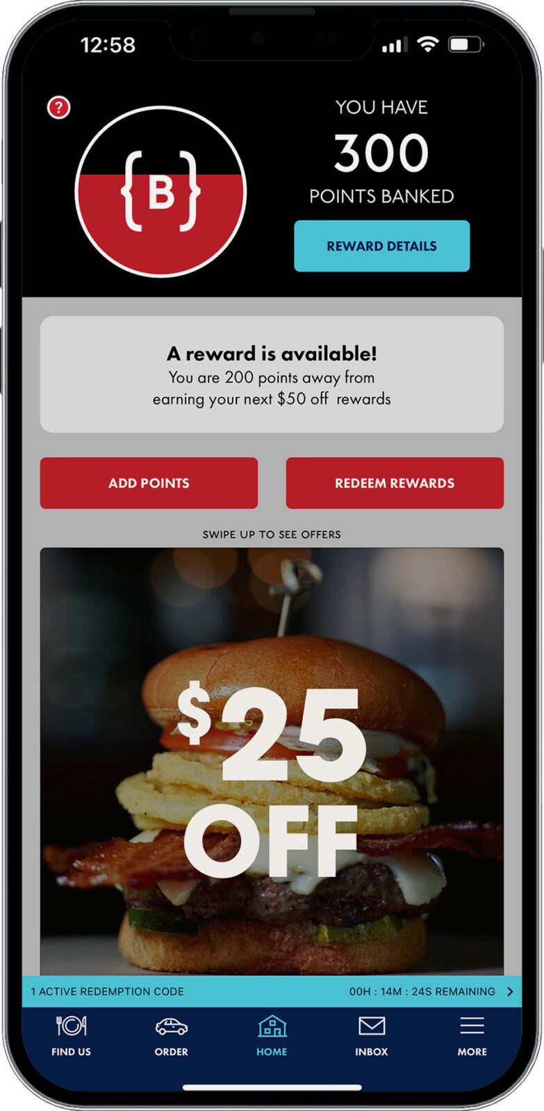 If you place an online order while logged into the Burtons Grill app, you’ll be able to apply any available rewards on the checkout screen, and points will automatically be earned once your payment is processed.